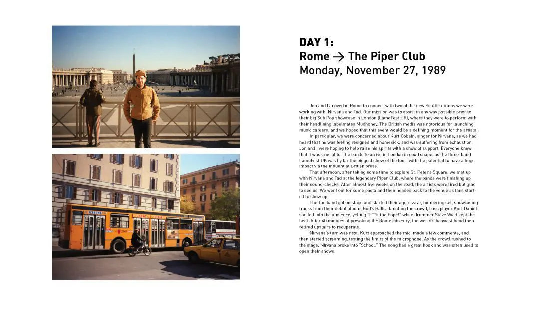 "Experiencing Nirvana is a photo journal, grunge rock micro-history, and an inside look into a crucial eight-day period in the touring life of Nirvana. In the last days of 1989, the young band goes from breaking up in Rome to winning over the influential British music press at Sub Pop’s LameFest U.K. showcase in London, setting the stage for their imminent popularity. At the end of a grueling six-week European tour to promote their Bleach debut, the band was exhausted and Cobain frustrated and downcast. Despite a stolen passport and an attempt to leap from a 14-foot speaker tower, Cobain managed to continue to London. Opening for Tad and Mudhoney at the Astoria Theatre on November 27, 1989, Nirvana’s heart-pounding performance won over the crowd.